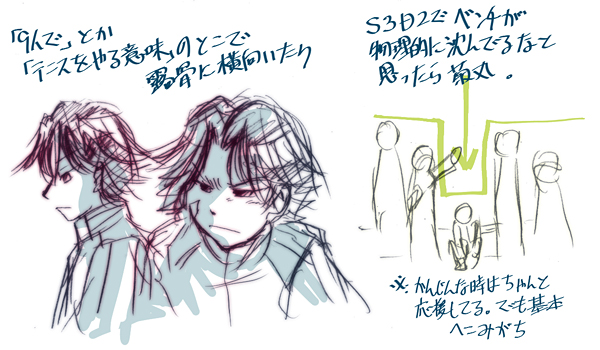 …からの、ベンチのサエさんがー! ちょっと前後しますが、S3の時の菊丸のベンチワーク?がとても印象的で、そこ見つつ、サエさんはどうなんだ? と見てたらなんかもう…。基本的にずっと険しい顔で観戦してて応援してて「千葉の負け犬」って言われた時に、組んでた腕をほどいて、ぐっ…! と肩をいからせて拳を握りしめる反応するんですよ。佐伯ー! 六角の佐伯ー!!