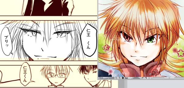 この二人が似てるなーって自分で思ってておともだちに似てるよねwと言ったら全然似てない大丈夫! って言われて、実際並べてみるとそんなに似てない…か。男女だしな。たぶん基本パーツ傾向(目とか顔周りの髪の毛)と自分で描く時の表情の付け方傾向が似てるんだろうな。そもそも性格は似てないし。仁王さんは口が達者で食わせ者系、右の子は直情径行口より先に手が出る系。