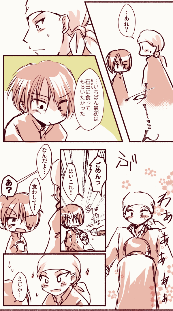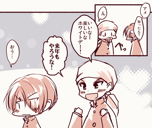 石田と神尾のホワイトデー 2019-04-172019-04-17 tks石田と神尾 バレンタインのつづき 彼氏がノリノリすぎてちょっとてれる 漫画描いてて長くなったらどんどん下に伸ばしていくんですけど縦長にしすぎるとカーソル移動がすごい距離ぶっ飛んでっていちいちイラッとする…しかし複数ページにするのもめんどい。 ❀WEB拍手❀