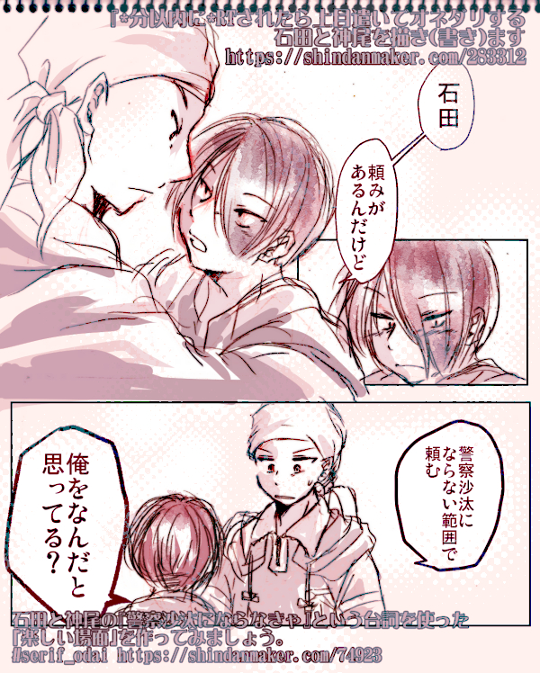 石田と神尾の『警察沙汰にならなきゃ』という台詞を使った「楽しい場面」を作ってみましょう。 #serif_odai
