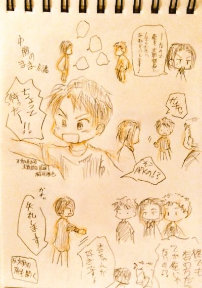 中腰のままそらむさんへの愛を語っているはずが結局伊武になるけんとさん、「ちょっと待ったーーー!!!!(ドアガチャ)橘さんから直々に部長を任されたのはこの俺、桜井だ!」「(反対側のドアガチャ)俺、杏ちゃんが好きです!!」