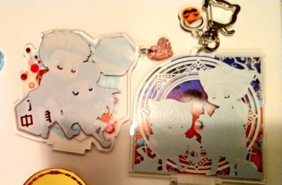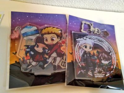 気持ちK9のが濃いか?って感じですが、K9のオーロラアクキーは表面にイラスト面を印刷するので単純比較は出来ないかな…。今回のはわりとデータ通りの色で出た気がします。鉄アキが、もっと背景濃くしたほうがいいかと思ったけど全然大丈夫でした。背景のオレンジ→紫グラデと雲が上手く出るか不安だったけど綺麗です。目の透け感と、あと提灯とランタンいい感じー。