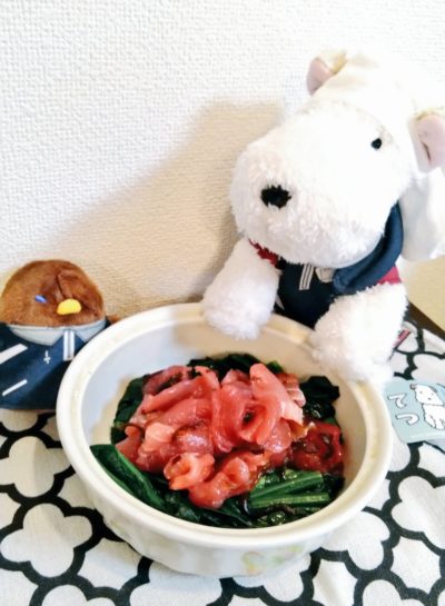 神尾の好物ほうれん草のおひたし~マグロの切り落とし塩昆布もみを添えて~