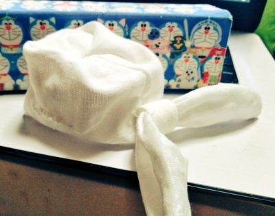 耳出すとこが、ちょっとかがってほつれどめ塗ってもまだボロいけど、てつが毛足長いからまあいいかと。キャラメルポーチの作り方を参考にして底作って後ろに結び目リボン付けました。布はガーゼ二枚重ね。まだ改良の余地ありそうですけどとりあえずはこれで。