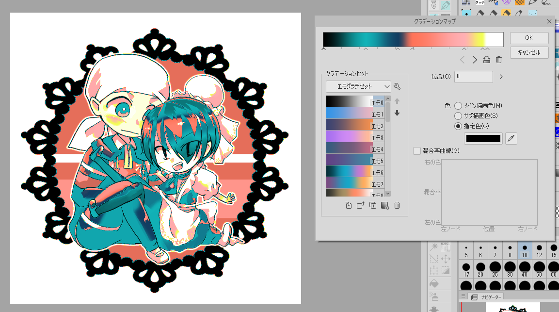一旦グラデーションマップのマスクで全部消して花模様とか光を適当にブラシで入れました。バックのレース模様は黒だと強すぎるなと思ったのであとで色変えました。…けど黒のままでも良かった気がする。あとグラデーションマップかけっぱなしでもそれはそれで良かった気も。多少透明度は下げて。