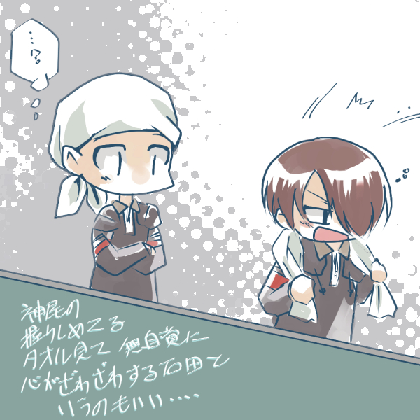 鉄アキ識者の考察により、神尾が試合後ずっとタオルを首にかけてるのにそわそわするのですが、峰スイッチングのときは片方の肩だけにかけててなんだか風呂上がり感(後で両肩に直してた)。