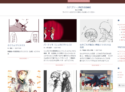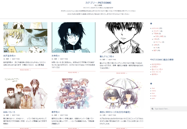 本拠地の方の絵が見づらいなーと思ってたのをどうにかこうにかテンプレをああだこうだしてなんとなく前よりは見やすくなったんじゃないかなーっていう自己満足。ブログテンプレのままだから一覧参照には向かないんですよねたぶん。こっちはブログだから上からだーっと記事が読めたほうが自分の好み
