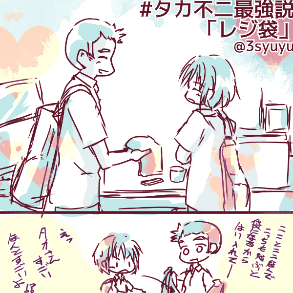 推しカプ同士を交流させてみたいやつ。タカさんはきらきらしてる不二をかっこいいなあと眺めることは毎日で慣れてるだろうから…。そんで毎日新鮮に楽しくときめいている、それがきっと河村隆…それ抜きにしてもタカさんと石田にはほのぼのと会話してほしい。他のお客さんの視界の妨げになるから常に後方壁際彼氏。身長188&180。