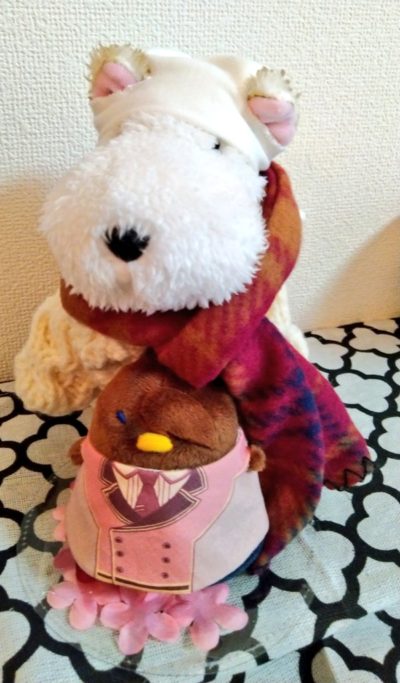 マフラーは100均のフリースに似た模様のがあったのでそれ切って縫った。セーターは編みました。