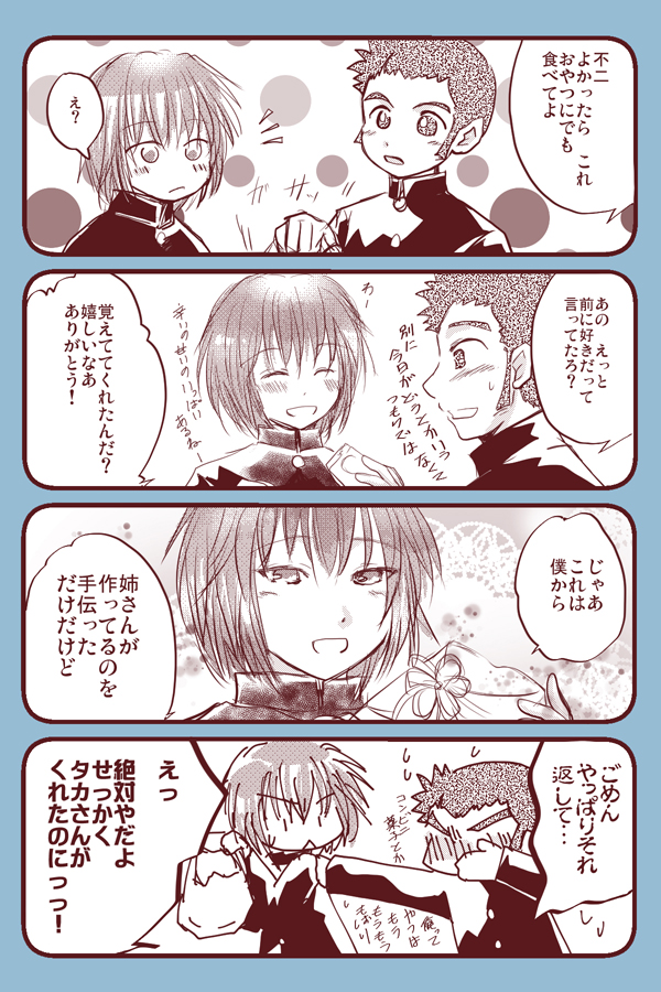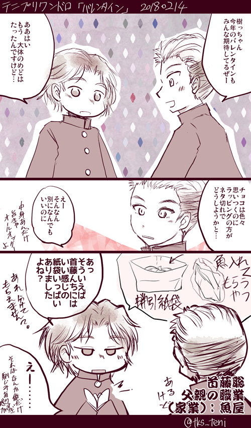 【テニプリワンドロ】さんの【バレンタイン】のテーマで 樹ちゃんと首藤。食堂と魚屋の息子たまらん。六角勢のバレンタインはサエさんとダビデ曰く「いちばんうまい」(サエキストーク)樹っちゃんの手作りチョコを貰えるのでなんだかんだいってきっと平和なんだと思います。いちばんうまいものをもらえるありがたさと安心感。