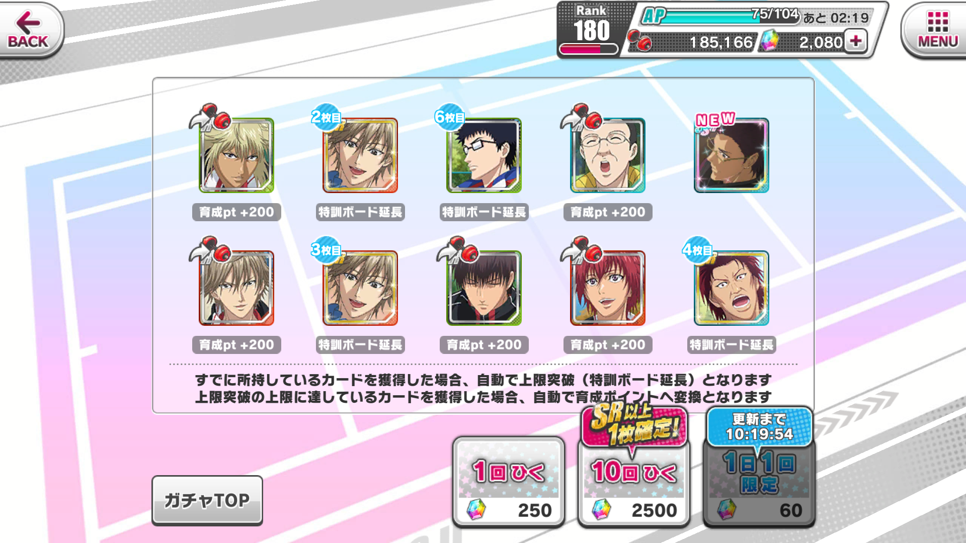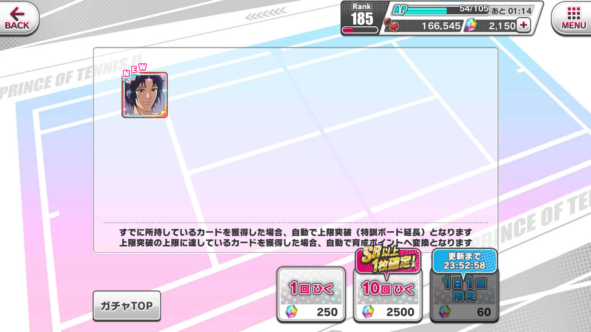 もう全然当たらないので惰性で画面も見ずにやったら女声が聞こえてしまった既所持SSRのリョーマか不二がかぶったかと思ったらまさかの神の子いらっしゃい。スクショは失敗しました。特効SSR二枚になったし、7000×人数分、ノルマ増やす色気出してもいいだろうか…。とりあえずは25000でサエさんの?シチュエーションカードまで頑張ります!見たい!欲しい!