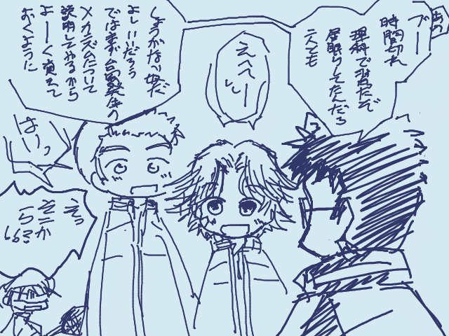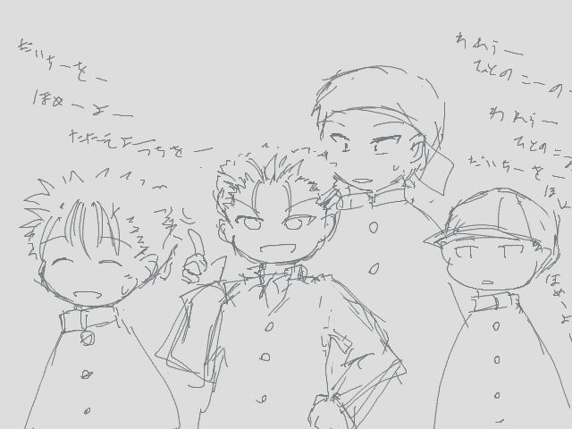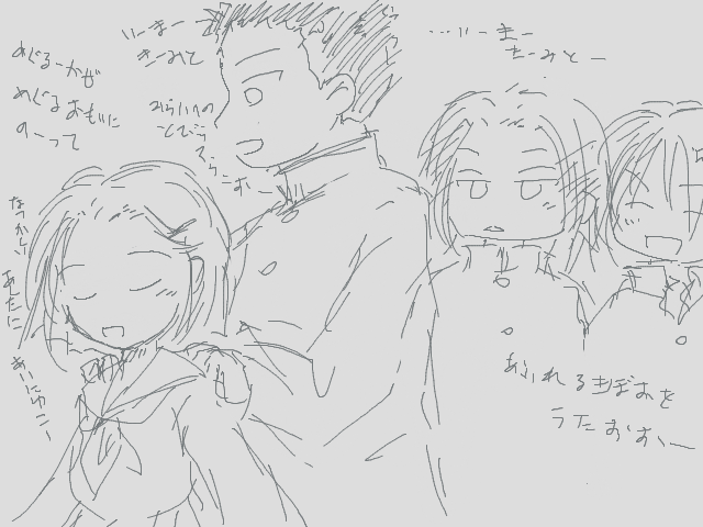 唐突にだいちさんしょうを歌い出す峰ダブルス (桜井の特技はカラオケ)。橘兄妹といぶかみはときのたびびと。